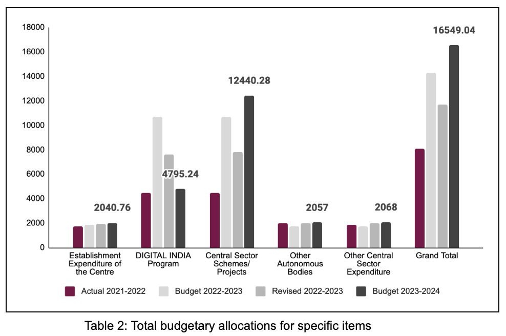 The total budgetary allocation for MeitY in the Budget for 2023-2024 is ₹ 16549.04 cr, this is a 15.73 % increase from the previous financial year budget. The increase is even higher when compared to the RE of 2022-2023, i.e., a year-on-year change of 41.2%. This is in contrast to the budgetary trends we witnessed in 2021 wherein, there was under-utilisation of the budget. We appreciate the decision to increase budgetary allocation to MeitY in the FY 2023-2024 and hope to see these funds be directed towards infrastructure development aimed at increasing tele-connectivity and broadband connectivity, as well as overall digital literacy.