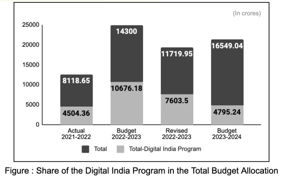 Allocation towards the Digital India Program reduced to ₹ 4795.24 crores in the 2023-2024 BE, witnessing a massive decrease of 55.08% and 36.93% in comparison to the allocation made in 2022-2023 BE and RE respectively. The decrease can mainly be attributed to reduction in allocation towards Promotion of Electronics and IT HW Manufacturing, PLI for Large Scale Electronics and IT Hardware, and Pradhan Mantri Gramin Digital Saksharta Abhiyan (PMGDISHA).