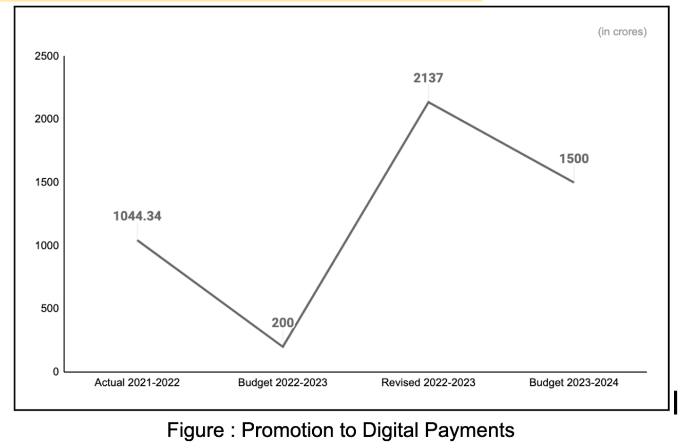 Perplexingly, the allocation to Promotions of Digital Payments has plummeted to Rs. 1500 crores as compared to ₹ 2137 crores allocated to it in the 2022-2023 RE, reflecting a decline of 29.8%. It must be noted that revised allocations increased sharply in 2022-2023 (₹ 2137 crores), witnessing a jump of 968.5% as compared to the 2022-2023 BE which stood at Rs. 200 crores. Even though the allocation in 2023-2024 is higher than the previous year’s BE, the former is still lower than the RE. The Finance Minister in their Budget speech for this FY noted that “Fiscal support for this digital public infrastructure (digital payments) will continue in 2023-24.”