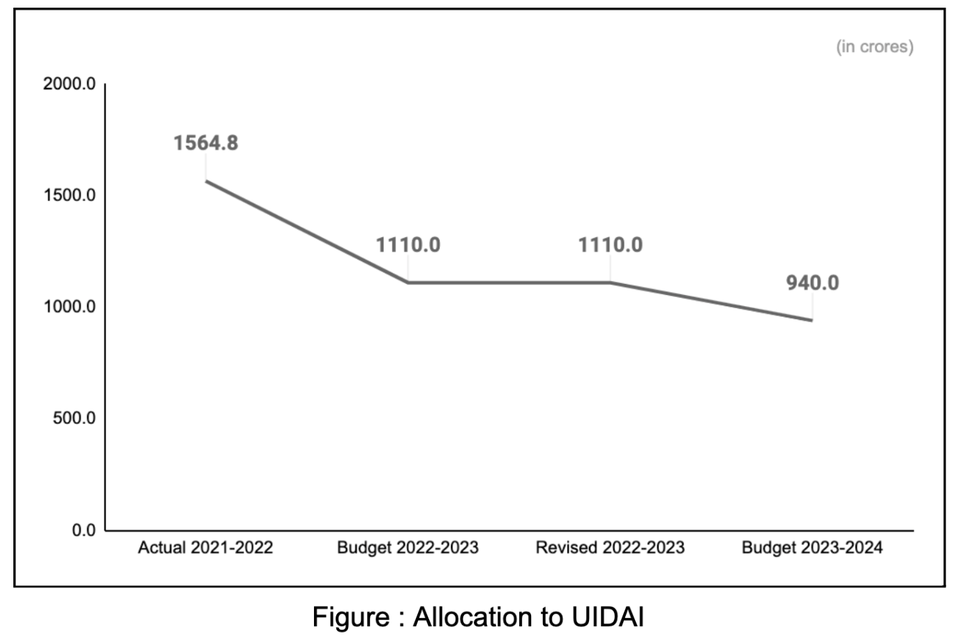Allocation to the Unique Identification Authority of India (UIDAI) decreased by 14.54% in 2023-2024 BE as compared to the 2022-2023 RE. The allocation in this FY is 39.92% less than what was actually utilised in 2021-2022, i.e. 1564.8 crores.
