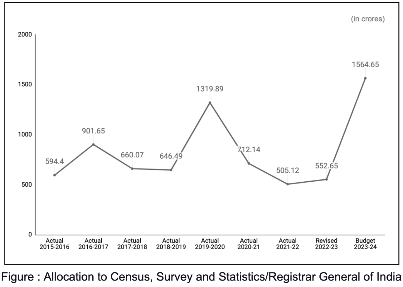 A substantial jump can be noted in the total allocation for the census which is 183.11% from the RE 2022-23 (₹ 552.65 crores). However, the budget suffered a cut of 57.42% when compared to the ₹ 3,676 crores allocated in 2022-23.