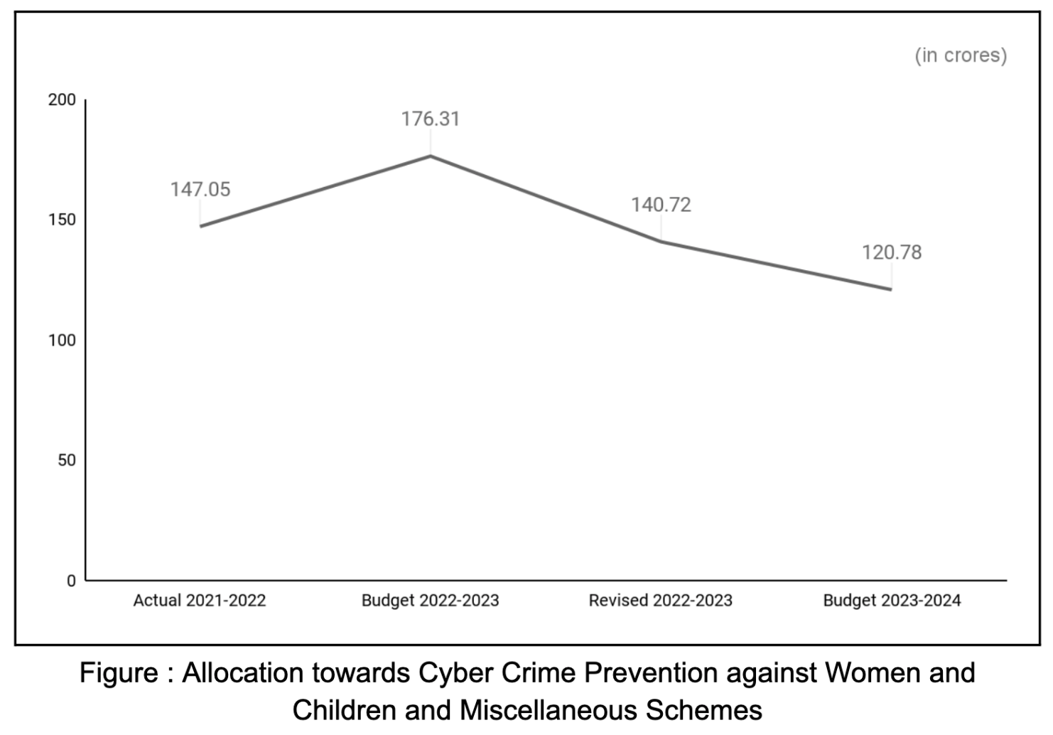 While the grant under Schemes for Safety of Women has improved considerably (60.5%), it is saddening to note a decreasing trend in the budget allocation for Cyber Crime Prevention against Women and Children and Miscellaneous Schemes, which has gone down to ₹ 120.78 crores in 2023-24 from ₹ 176.31 crores in 2022-23 indicating a drop of 31.49%.