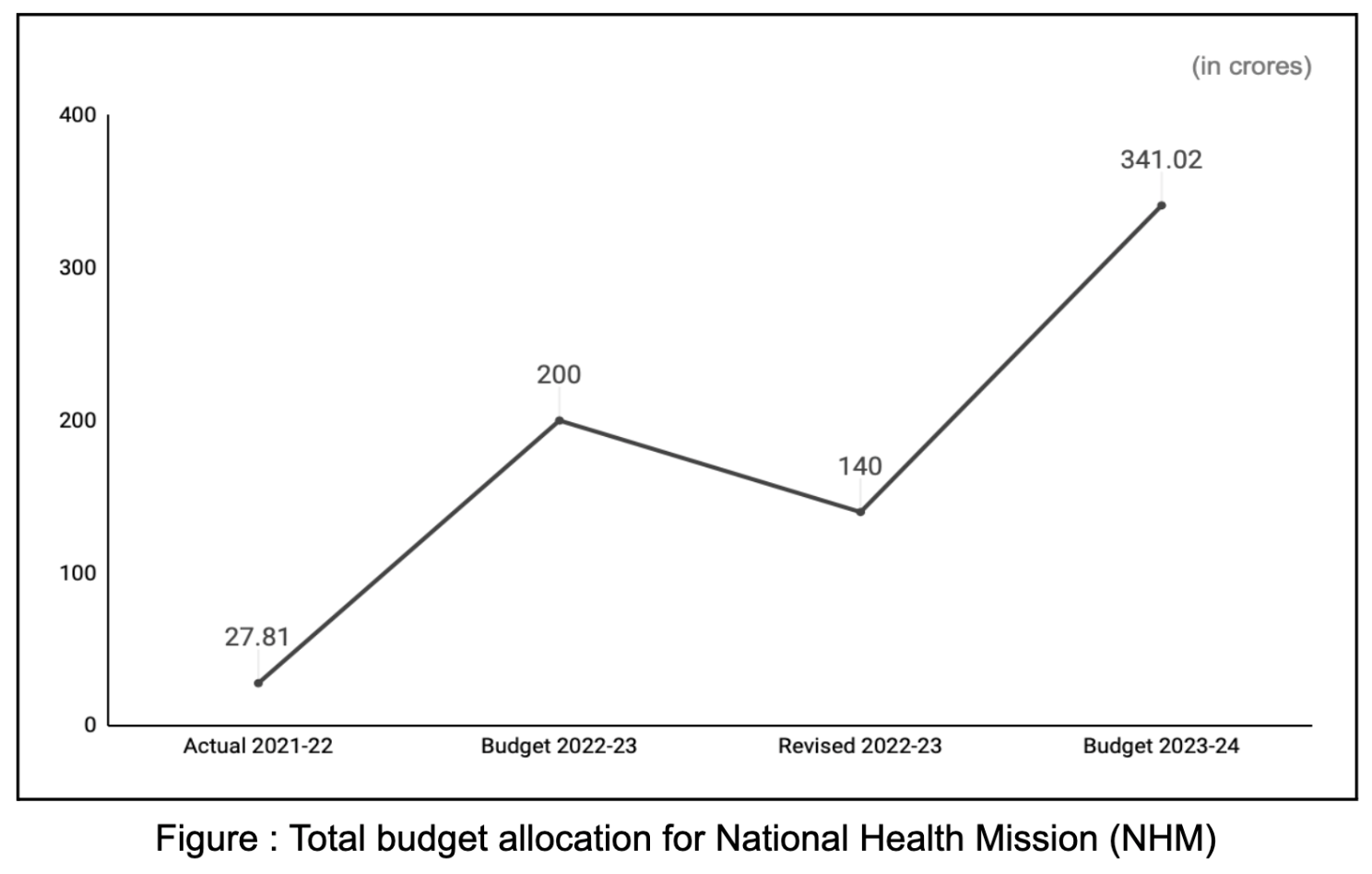 - For the NHM, allocation in Budget Estimates (BE) 2023-2024 (₹ 341.02 crores) saw an increase of 143.58% as compared to the Revised Estimates (RE) of 2022-23 (₹ 140 crores).
