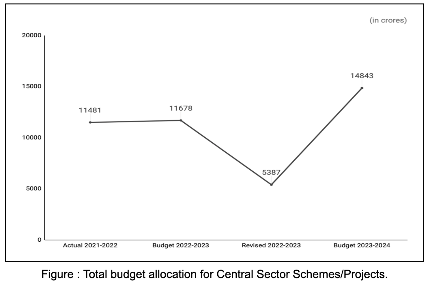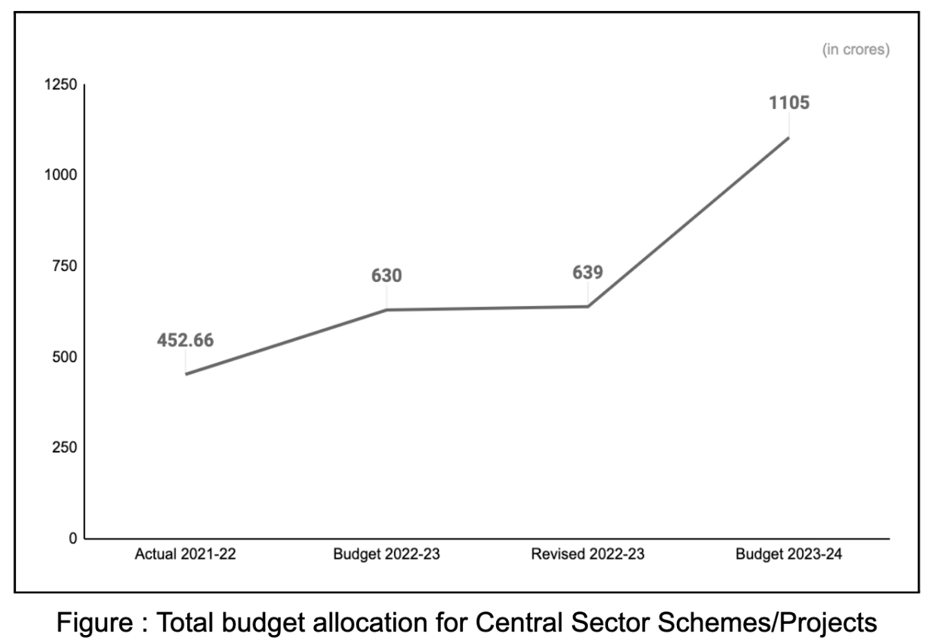 We note that there has been a 175.55% increase in BE 2023-24 (₹14843.32 crores) from RE 2022-23 (₹5386.73 crores) and 27.10% increase from BE 22-23 (₹11678) under Central Sector Schemes/Projects.