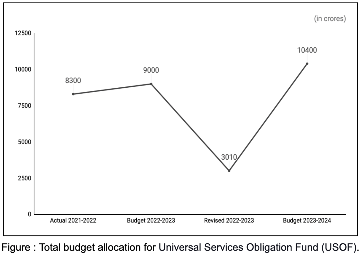 A 15.56% increase is seen in the budget allocated for the Universal Services Obligation Fund (USOF), which is ₹10,400 crores. This is admittedly a 15.56% increase from BE 2022-2023. However, a point of concern arises as out of ₹ 9,000 crores allotted last year, only ₹3,010 was retained in the RE, reflecting a decline of 66.33%.