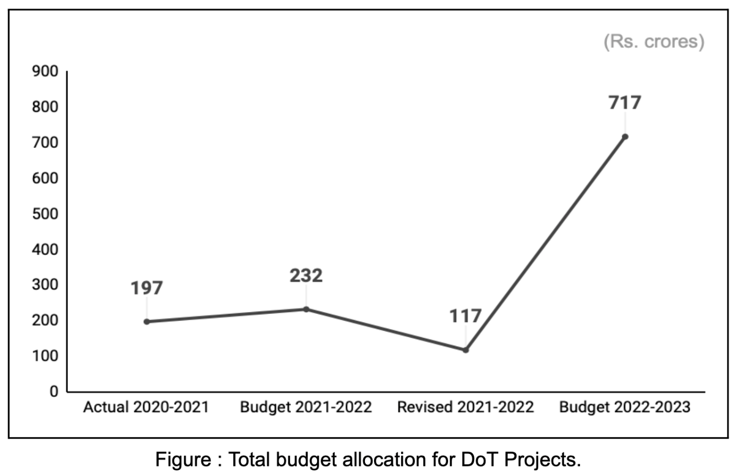The total Budgetary allocation for DoT projects for the year 2023-2024 is ₹2285.32 crores, which is a 219.61% increase from the BE 2022-2023 and 448.86% from the RE 2022-2023. One of the key reasons for the increase in grant to the Department are the allocations made for the Domestic Industry Incentivisation Scheme (₹ 915 crores), wireless planning and coordination (₹756.42 crores) and digital intelligence unit project (₹220 crores). The Domestic Industry Incentivisation Scheme provides for Technology Development and Investment Promotion (₹55 crore), Champion Service Sector Scheme (₹60 crore) and Production Linked Incentive Scheme (₹800 crore). Allocation towards the Digital intelligence Unit (DIU) has significantly increased, receiving an allocation of ₹ 220 crores as opposed to only 10 crores in the previous year’s budget. The Project's objective is for investigating fraudulent activity involving telecom resources, such as Unsolicited Commercial Communication (UCC) etc.