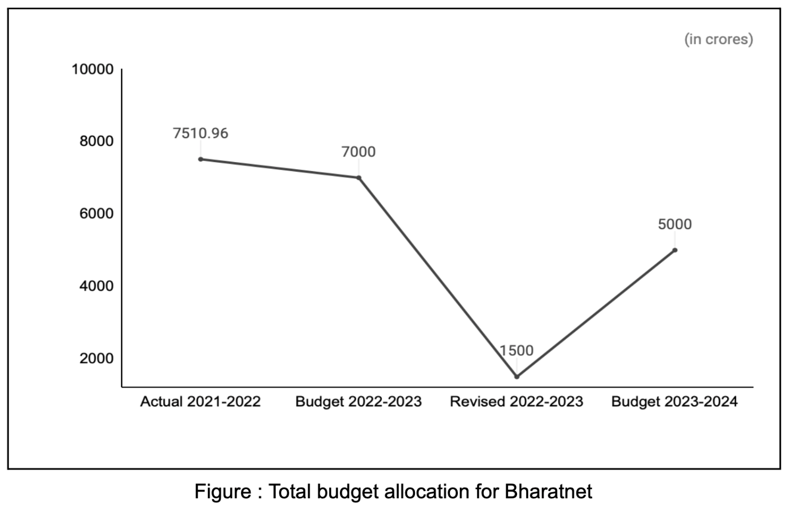 As far as allocations for Bharatnet are concerned, there has been a significant increase of 233.33% in BE 2023-24 (₹5000 crores) from RE (₹1500 crores) and a decrease of 28.57% from BE 22-23 (₹7000 crores). The grant goes towards the creation of telecom infrastructure required for providing broadband connectivity to all the Gram Panchayats in the country and facilitating non-discriminatory access to service providers, for provisioning of broadband services in rural areas.
