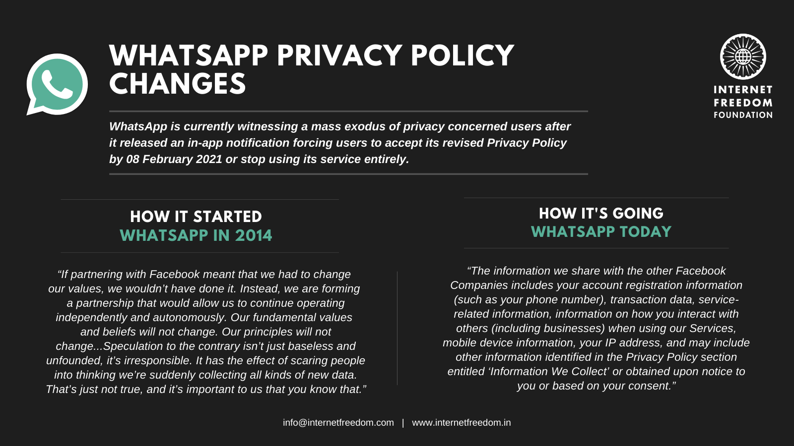Recently, WhatsApp released an in-app notification forcing users to accept its revised privacy policy by 08 February 2021 or stop using its service entirely. The new privacy policy confirms that Facebook may now have access to messages shared with businesses on WhatsApp and it provides more insight into expansive meta data collection by WhatsApp. The latest changes to WhatsApp’s privacy policy cement the problematic status quo which has existed since the privacy policy was first updated in 2016. The changes to WhatsApp’s privacy policy in 2016 are also the subject of pending litigation before the Supreme Court of India in Karmanya Singh Sareen v. Union of India, where IFF is an intervenor.